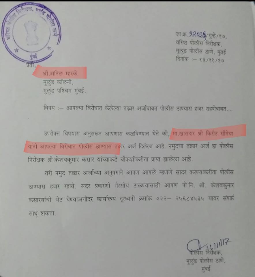 भाजपचा महाराष्ट्रातील भ्रष्टाचारा विरोधात लढणारा चेहरा म्हणून ओळखलेजाणारे मुंबईतील खासदार किरीट सोमैया यांनी मागील आठवड्यात मुलुंड मधील आर. टी. आय. कार्यकर्ते- अनिल म्हस्के यांच्या विरोधात वरिष्ठ पोलीस निरिक्षक, केशवकुमार कासार (मुलुंड पोलीस ठाणे, मुंबई) यांच्याकडे तक्रार केली आहे.