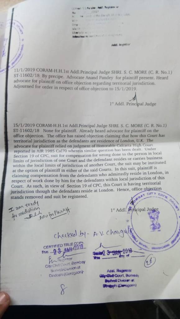 Initially, the Department of City Civil Court Mumbai objected to registering the said lawsuit against the UK based company on the grounds of international territorial jurisdiction. However, Advocate Anand Pande, who appeared for Indian complainant company, argued before the court on the point of territorial jurisdiction. He pointed out to the court that under section 20(c) of the Civil Procedure Code 1906, an aggrieved litigant was entitled to file a lawsuit in India if the full or part of the cause of the action had arisen within the jurisdiction of the local Indian Court.