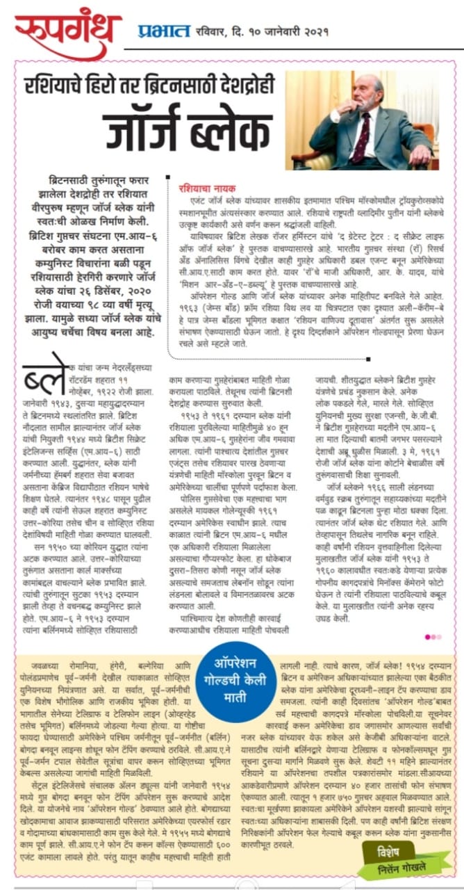 ब्रिटनसाठी तुरुंगातून फरार झालेला देशद्रोही तर् रशियात वीरपुरुष म्हणून जॉर्ज ब्लेक यांनी स्वतःची ओळख निर्माण केली. ब्रिटीश गुप्तचर संघटना एम.आय-६ बरोबर काम करत असताना कोम्मुनिस्ट विचारांना बळी पडून रशिया साठी हेरगिरी करणारे जॉर्ज ब्लेक यांचा डिसेंबर २६, २०२० रोजी वयाच्या ९८ व्य वर्षी मृत्यू झाला. यामुळे सध्या जॉर्ज ब्लेक यांचे आयुष्य चर्चेचा विषय बनला आहे.