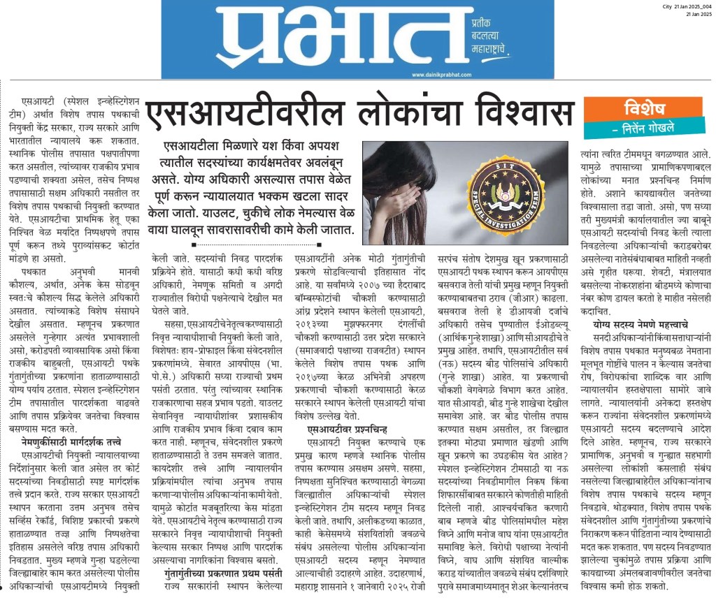 उदाहरणार्थ, महाराष्ट्र शासनाने १ जानेवारी २०२५ रोजी सरपंच संतोष देशमुख खून प्रकरणासाठी एसआयटी पथक स्थापन करून आयपीएस बसवराज तेली यांची प्रमुख म्हणून नियुक्ती करण्या बाबतचा ठराव (जीआर) काढला. बसवराज तेली हे डीआयजी दर्जाचे अधिकारी, तसेच पुण्यातील ईओडब्ल्यू (आर्थिक गुन्हे शाखा) आणि सीआयडीचे ते प्रमुख आहेत. तथापि, एसआयटीतील सर्व (नऊ) सदस्य बीड पोलिसांचे अधिकारी (गुन्हे शाखा) आहेत. या प्रकरणाची चौकशी वेगवेगळे विभाग करत आहेत. यात सीआयडी, बीड गुन्हे शाखेचा देखील समावेश आहे. जर बीड पोलिस तपास करण्यात सक्षम असतील, तर जिल्ह्यात इतक्या मोठ्या प्रमाणात खंडणी आणि खून प्रकरणे का उघडकीस येत आहेत? स्पेशल इंव्हेस्टिगेशन टीमसाठी या नऊ सदस्यांच्या निवडीमागील निकष किंवा शिफारसींबाबत सरकारने कोणतीही माहिती दिलेली नाही. आश्चर्यचकित करणारा पैलू म्हणजे बीड पोलिसांमधील महेश विघ्ने आणि मनोज वाघ यांना एसआयटीट समाविष्ट केले. विरोधी पक्षाच्या नेत्यांनी विघ्ने, वाघ आणि संशयित वाल्मिक कराड यांच्यातील जवळचे संबंध दर्शविणारे पुरावे समाजमाध्यमातून शेअर केल्यानंतरच त्यांना त्वरित टीम मधून वगळण्यात आले. यामुळे तपासाच्या प्रामाणिकपणाबद्दल लोकांच्या मनात प्रश्नचिन्ह निर्माण होते. अशाने कायद्या वरील जनतेच्या विश्वासाला तडा जातो. असो, पण सध्या तरी मुख्यमंत्री कार्यालयातील ज्या बाबूने एसआयटी सदस्यांची निवड केली त्याला निवडलेल्या अधिकाऱ्यांची कराड बरोबर असलेल्या नाते सामंदाबाबत माहिती नव्हती असे गृहीत धरूया. शेवटी, मंत्रालयात बसलेल्या नोकरशहांना बीडमध्ये कोणाचा नंबर कोण डायल करतो हे माहित नसेलही कदाचित.