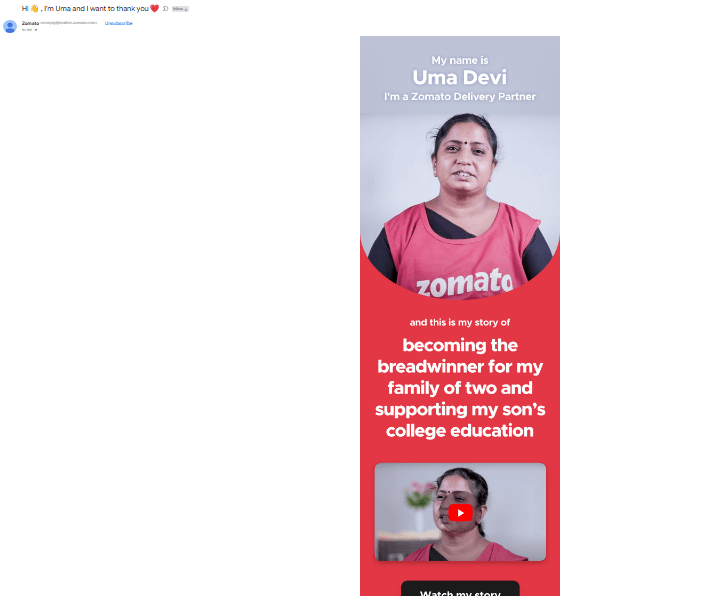 Zomato CEO Deepinder Goyal spent a day as his company’s delivery executive in October last year. The initiative was an attempt to connect emotionally with people, unlike Swiggy. The human touch is visible in their email campaigns as well. And this helps the brand in maintaining a point of difference with Swiggy’s campaign. Such emotional storytelling helps build empathy besides strengthening brand trust.