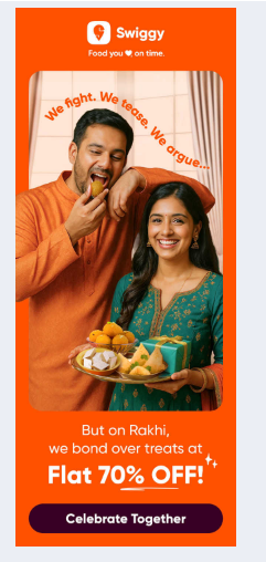 Sajid Khan’s films have superb locations, dialogues, a bit of suspense, great performances, and catchy music. In short, these films are a perfect entertainment package. Similarly, Swiggy emails have an interesting subject line, beautiful and rich visuals, a great copy, and an offer that the user would surely think about redeeming.