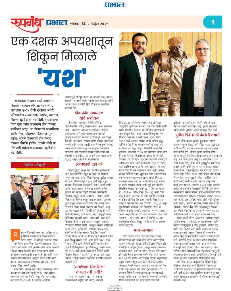 भारताच्या दौऱ्यावर आले असताना ब्रिटनचे पंतप्रधान कीर स्टार्मर यांनी ८ ऑक्टोबर २०२५ रोजी मुंबईच्या अंधेरी परिसरातील वायआरएफ, अर्थात, यश राज फिल्म्स स्टुडिओला भेट दिली. वायआरएफ येत्या दोन वर्षांत ब्रिटनमध्ये तीन चित्रपट बनविणार असून, या चित्रपटांचे छायाचित्रण आणि पोस्ट-प्रोडक्शन ब्रिटनमध्ये पूर्ण होईल. यामुळे ब्रिटनमध्ये तीन हजार नोकऱ्या निर्माण होतील. स्टार्मर यांनी या निर्णयाची प्रशंसा करण्यासाठी स्टुडिओला भेट दिली. यश राज फिल्म्सचे कर्ताधर्ता अदित्य चोप्रा हे ब्रिटिश पंतप्रधानांना वैयक्तिकरित्या भेटले नाहीत. ते प्रसिद्धी टाळतात आणि क्वचितच सार्वजनिक ठिकाणी वावरतात. चोप्रा यांनी त्याची पत्नी राणी मुखर्जी-चोप्रा आणि कंपनीचे सीईओ अक्षय विडाणी यांना भेटण्यासाठी आणि अभिवादन करण्यासाठी पाठवले. हे यश आणि मान-सन्मान मिळवण्यासाठी अदित्य चोप्रा आणि त्यांचे वडील, वायआरएफचे संस्थापक यश चोप्रा, यांनी कठोर परिश्रम घेतले आहेत.