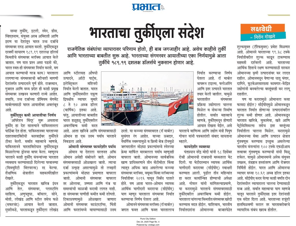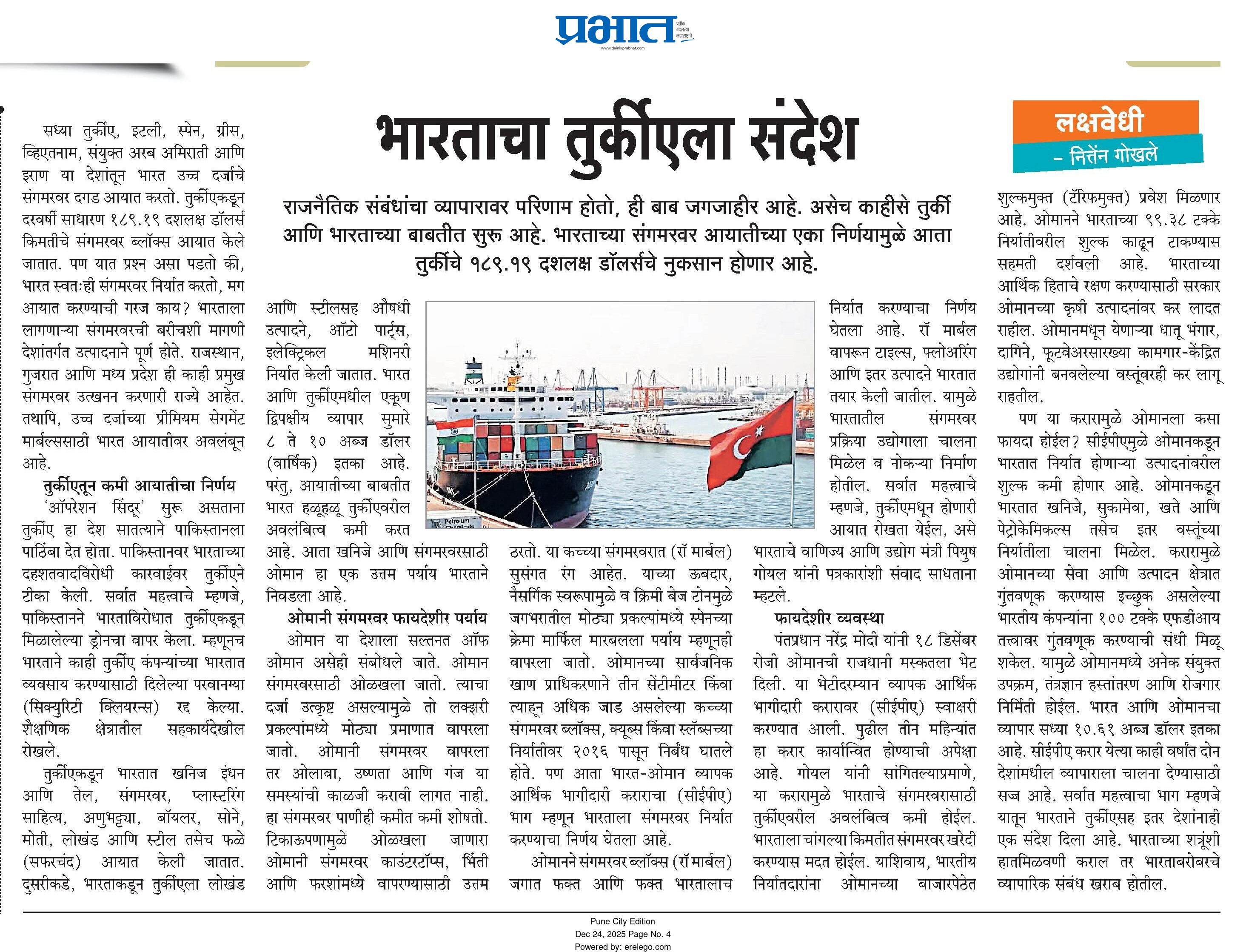 पण या करारामुळे ओमानला कसा फायदा होईल? सीईपीएमुळे ओमानकडून भारतात निर्यात होणाऱ्या उत्पादनांवरील शुल्क कमी होणार आहे. ओमानकडून भारतात खनिजे, सुकामेवा, खते आणि पेट्रोकेमिकल्स तसेच इतर वस्तूंच्या निर्यातीला चालना मिळेल. करारामुळे ओमानच्या सेवा आणि उत्पादन क्षेत्रात गुंतवणूक करण्यास इच्छुक असलेल्या भारतीय कंपन्यांना १०० टक्के एफडीआय तत्त्वावर गुंतवणूक करण्याची संधी मिळू शकेल. यामुळे ओमानमध्ये अनेक संयुक्त उपक्रम, तंत्रज्ञान हस्तांतरण आणि रोजगार निर्मिती होईल. भारत आणि ओमानचा व्यापार सध्या १०.६१ अब्ज डॉलर इतका आहे. सीईपीए करार येत्या काही वर्षांत दोन देशांमधील व्यापाराला चालना देण्यासाठी सज्ज आहे.सर्वात महत्त्वाचा भाग म्हणजे यातून भारताने तुर्कीएसह इतर देशांनाही एक संदेश दिला आहे. भारताच्या शत्रूंशी हातमिळवणी कराल तर भारताबरोबरचे व्यापारिक संबंध खराब होतील.
